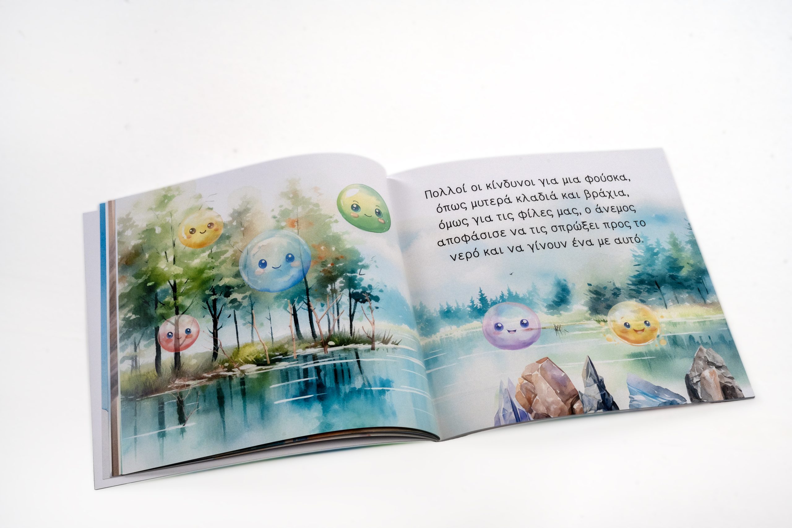In the tale "Foyskes (Bubbles)," a mother and her child enjoy blowing soap bubbles for fun, but the wind carries them away. Drifting over the forest and landing in a distant lake, the bubbles embark on an adventure. Eventually, with the help of the wind, they find their way back to their friends. The story highlights the significance of kindness and its rewarding nature.