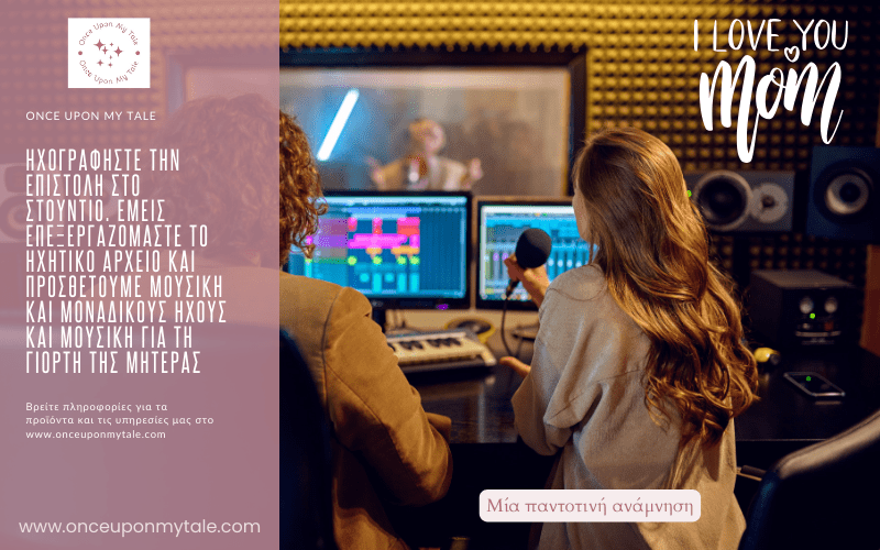 Είναι η εποχή όπου ανθίζει η αγάπη, και φέτος η Once Upon My Tale προσφέρει μια μοναδική εμπειρία για να κάνετε την Γιορτή της Μητέρας αξέχαστη. Μια όμορφη και πρωτότυπη ιδέα είναι να ηχογραφήσουν τα παιδιά ένα μήνυμα για την αγαπημένη τους μανούλα, σε επαγγελματικό στούντιο ηχογράφησης. - οι φωνούλες τους θα μείνουν στην καρδιά της μαμάς, η οποία θα κρατήσει για πάντα την ανάμνηση της τρυφερής παιδικής ηλικίας.
